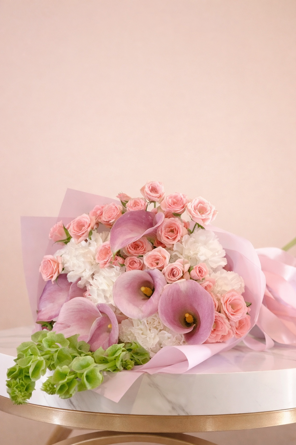 An artistic floral composition inspired by impressionist gardens and natural movement. Featuring soft pink calla lilies, hydrangeas, and delicate pastel blooms, this bouquet creates a rich and expressive visual experience.