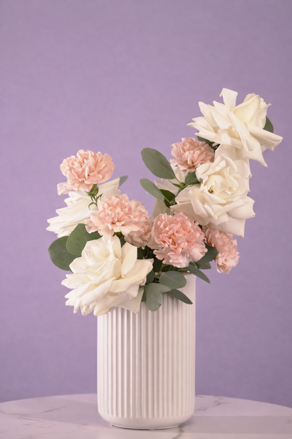 A refined floral arrangement presented in a sculptural ceramic vase, featuring ivory roses, soft peach carnations, and fresh eucalyptus greenery.