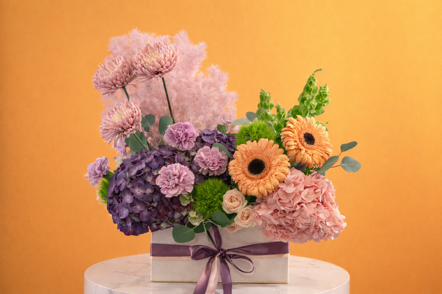 This arrangement brings together soft pastels, muted purples, and fresh green accents in a carefully balanced composition. Each flower plays its role with intention, creating movement, depth, and contrast without excess. L’Harmonie feels expressive yet refined, designed as a floral dialogue where color, texture, and form meet in quiet elegance.