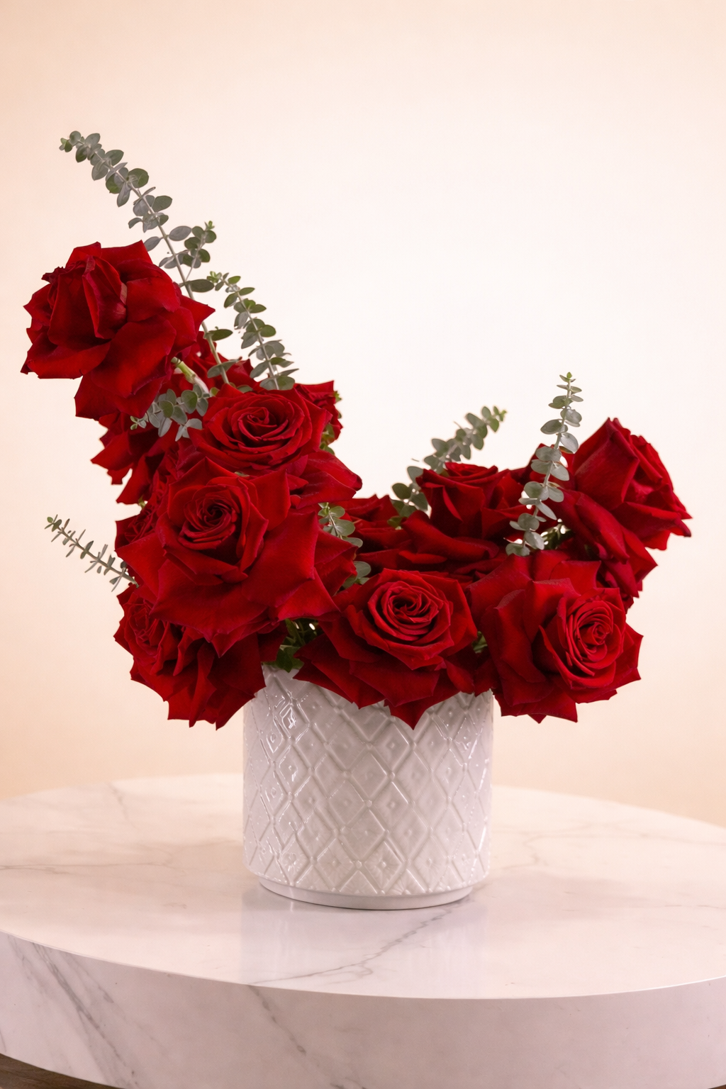 An artistic composition of rich red roses with subtle greenery, arranged in a modern, dynamic silhouette. Velours Carmine blends drama and elegance, creating a bold yet refined presence.